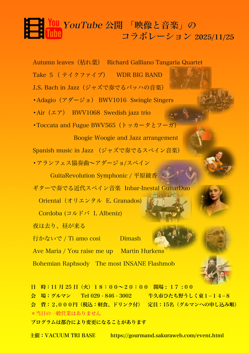 その後、どの様なかたちで継続開催していくかなどを検討しながら、会も「VACUUM TRI BASE」と名称を付け、同好会として活動を続け、店舗の営業にも支障が生じないようにご協力をいただき、隔月定例( 最終火曜日: グルマン定休日)として、コンサートを継続的に開催しています。